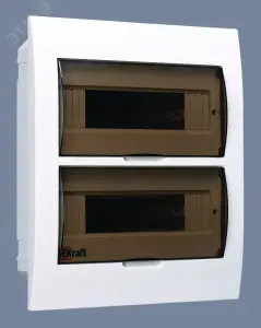 Корпус пластиковый встраиваемый для электрических аппаратов серии ЩРВ-П IP41 используют для установки в них модульной защитной аппаратуры. Дизайн корпуса имеет элегантные и скругленные формы, как и дверца, ее цвет темное органическое стекло. Фронтальные части корпуса, дверца, основание корпуса изготавливаются из самозатухающего ABS-пластика. Корпус имеет штампованные вводы для кабелей с разных сторон. Корпус является встраиваемым, имеет 2 черных DIN-рейки и 24 модулей (18 мм) для установки устройств, изолированные держатели для шинок, шинки N и PE. Дверцы на каждый ряд фиксируются в верхнем положении. Щиток на 100% совместим с модульным оборудованием Dekraft и Systeme Electric.